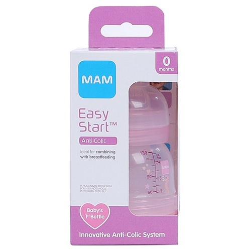 - Bình sữa Mam Easy Start Anticolic 130ml (hồng) có núm ty dạng phẳng giúp bé dễ dàng ngậm bú.